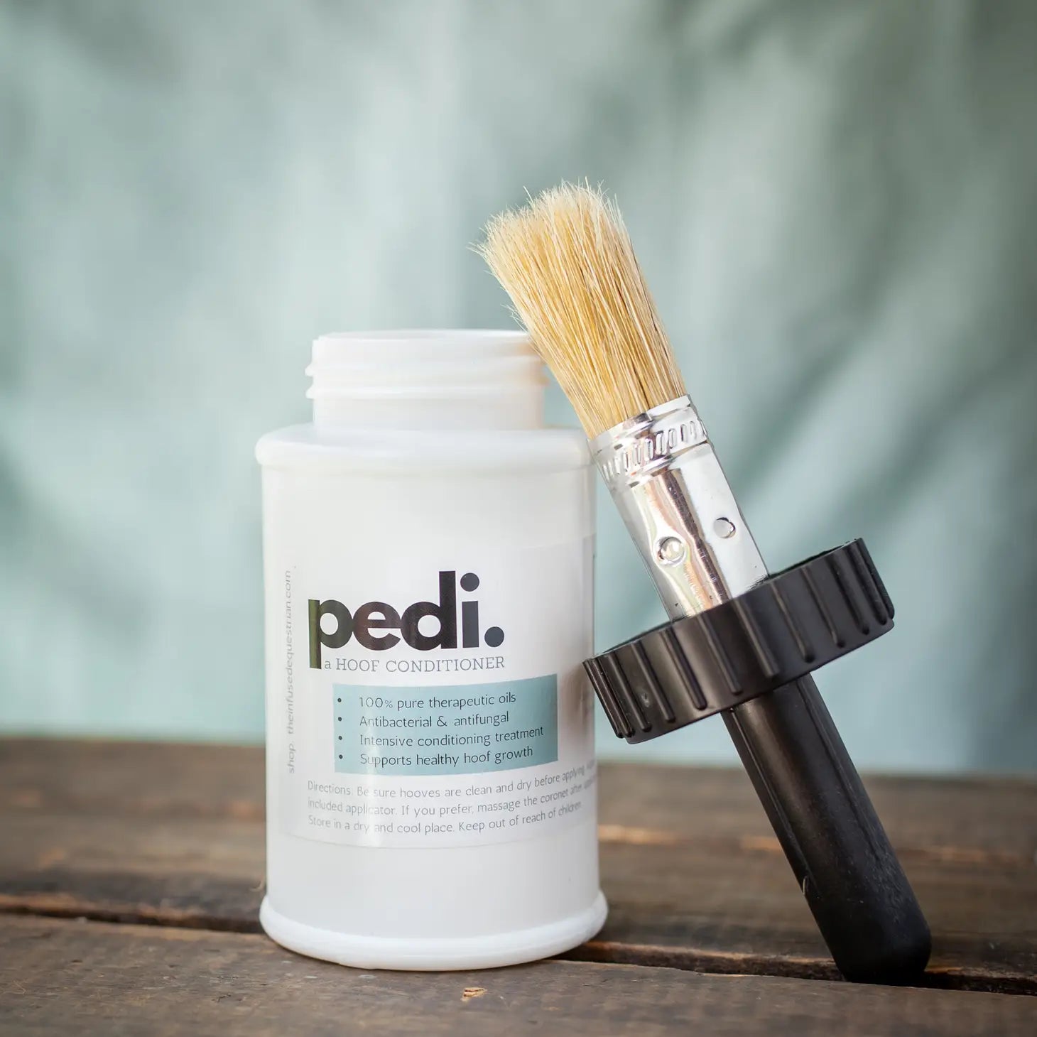 pedi. A Hoof Conditioner - Half Pint (8 oz) or Full Pint (16 oz) Benefits: Helps prevent thrush and other bacteria build up with carrot seed and tea tree oils Nourishes dry, cracked hooves with a therapeutic, topical treatment Allows the hoof to breathe, which is essential for a healthy hoof Strengthens the entire hoof from the coronary band to the sole and frog Assists resolution with issues associated to sore feet, quarter cracks, laminitis and thrush Handmade in the U.S.A. from all natural ingredients Ditch the chemicals and choose eight ounces of healthy alternative for your horse. Our proprietary blend nourishes the hoof and is easy to apply. Made with 100% pure therapeutic essential oils. Simply brush the conditioner on after cleaning and drying the hoof. We even include the brush! Contains: Olive Oil, Aloe Vera Gel, Balsam Fir, Carrot Seed and Tea Tree.