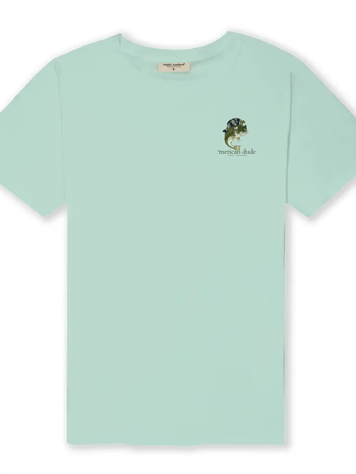 Blue green short sleeve shirt with the phrase ''merican dude' and a bass fish wearing a hat and shades. Simply Southern logo below and on left chest. 100% cotton. Unisex sizing.