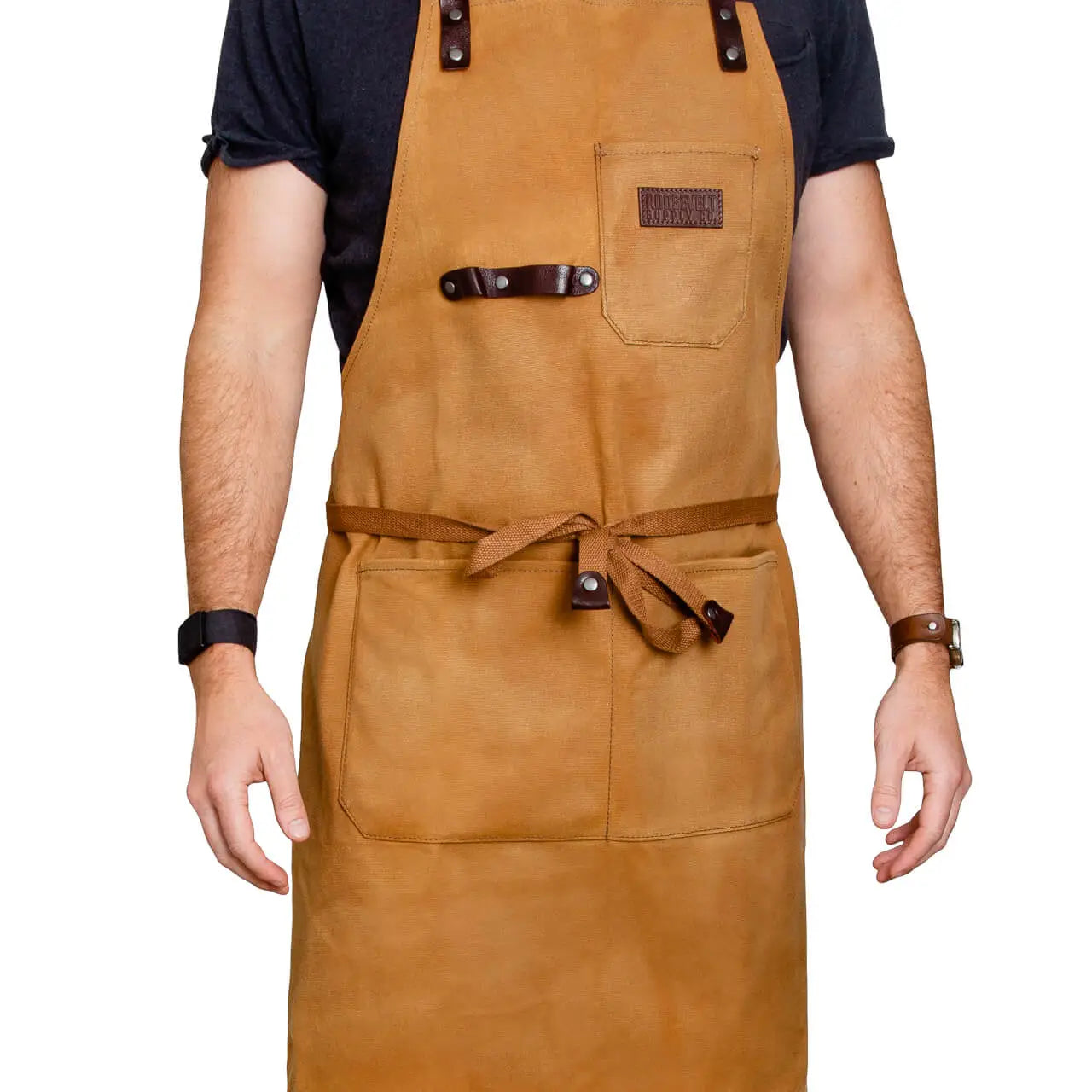Made from durable, water resistant waxed canvas, our shop aprons are the ultimate in utility and durability. The waxed canvas creates an incredible barrier for grease, water, paint, hair and wax. Whether you're in the shop, studio or grilling in the backyard, our aprons are the best out there! Comes with a chest pocket, two large waist pockets and a leather button chest strap to hold everything you need to get your work done. Two straps tighten and secure the apron. Size: 31" L x 21" W